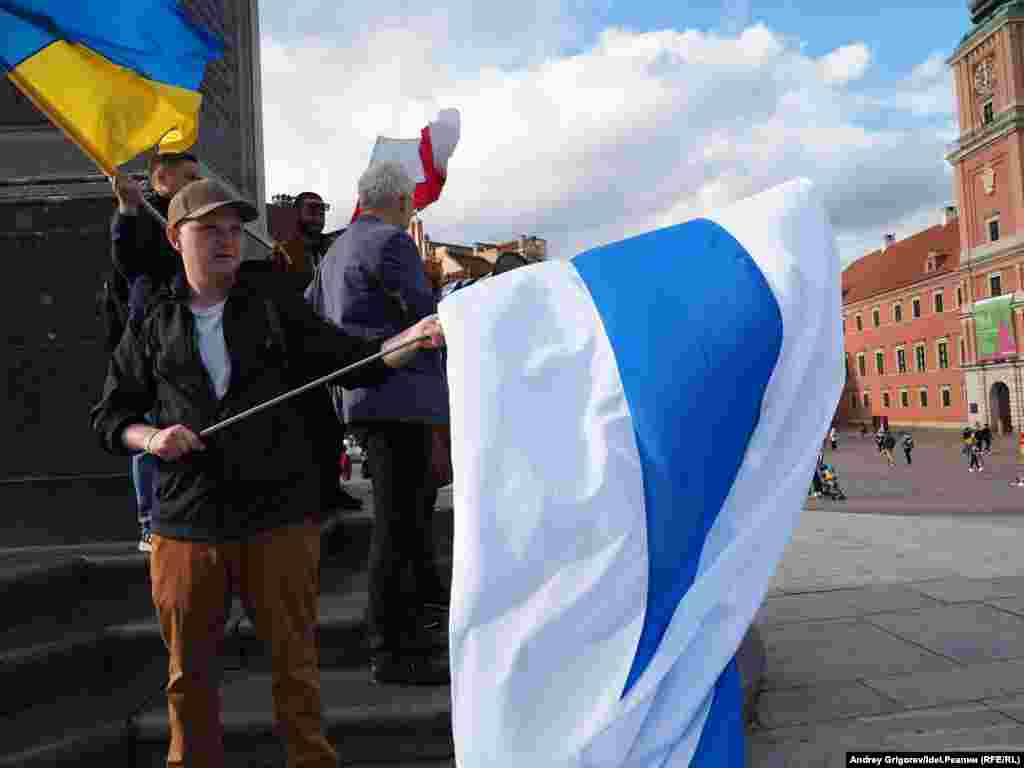 Очередной антивоенный митинг на Замковой площади в Варшаве 21 мая был посвящен памяти жертв российской агрессии в Украине. Россияне, выступающие против войны, кроме плакатов и флагов держали в руках снимки украинцев, пострадавших в результате действий армии РФ.