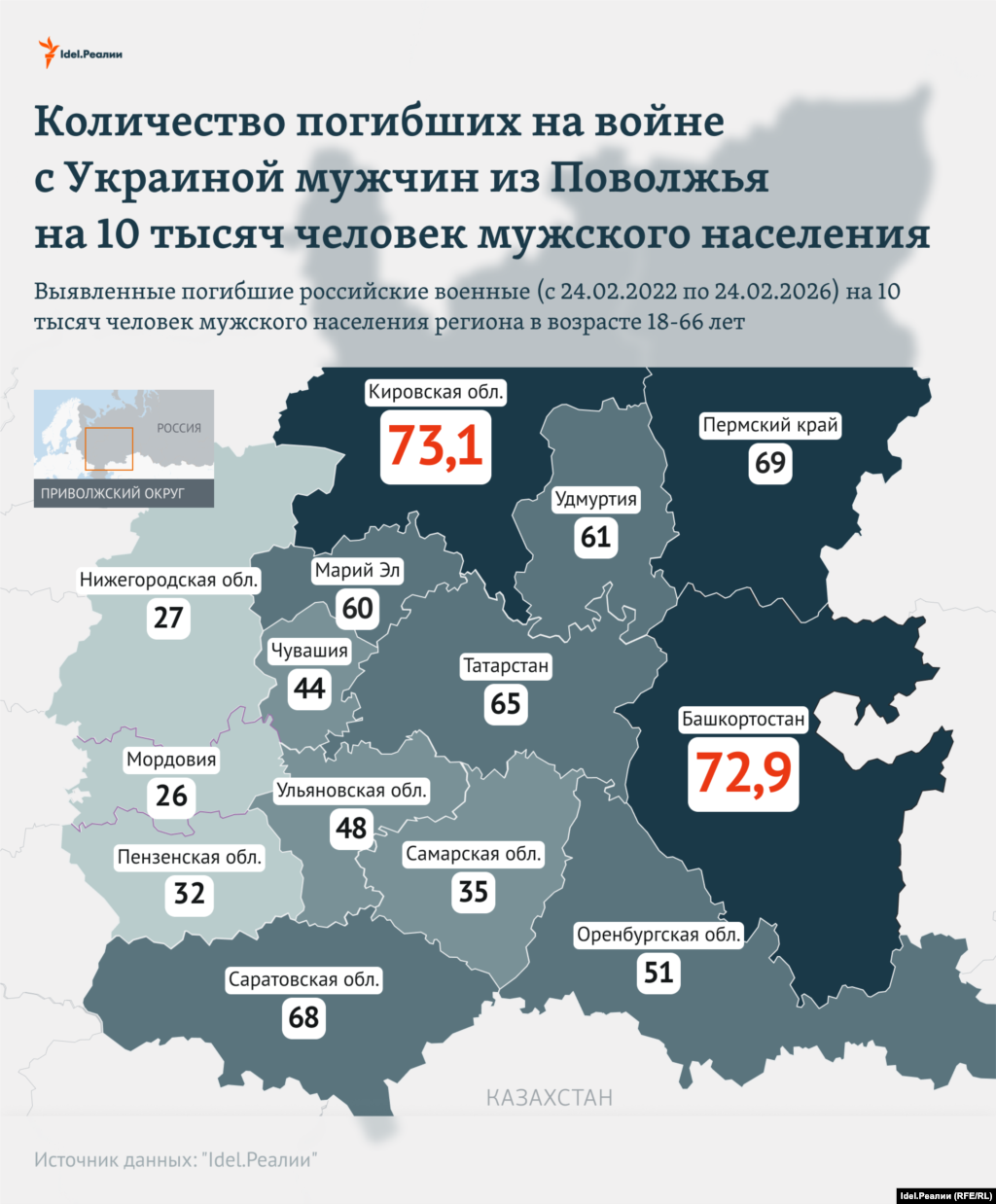 Кировская область остается лидером в Поволжье по количеству погибших на войне против Украины на 10 тысяч мужского населения (73,1 мужчины) в возрасте от 18 до 66 лет. Об этом свидетельствуют подсчеты "Idel.Реалии" на 24 февраля 2026 года, основанные на данных из базы погибших уроженцев Поволжья с начала полномасштабного вторжения России в Украину.