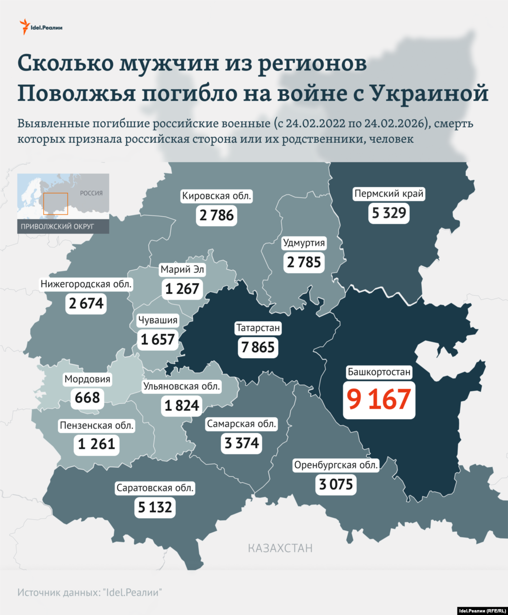 По состоянию на утро 24 февраля погибло по меньшей мере 50 551 человека из регионов ПФО (плюс Астраханская область).
