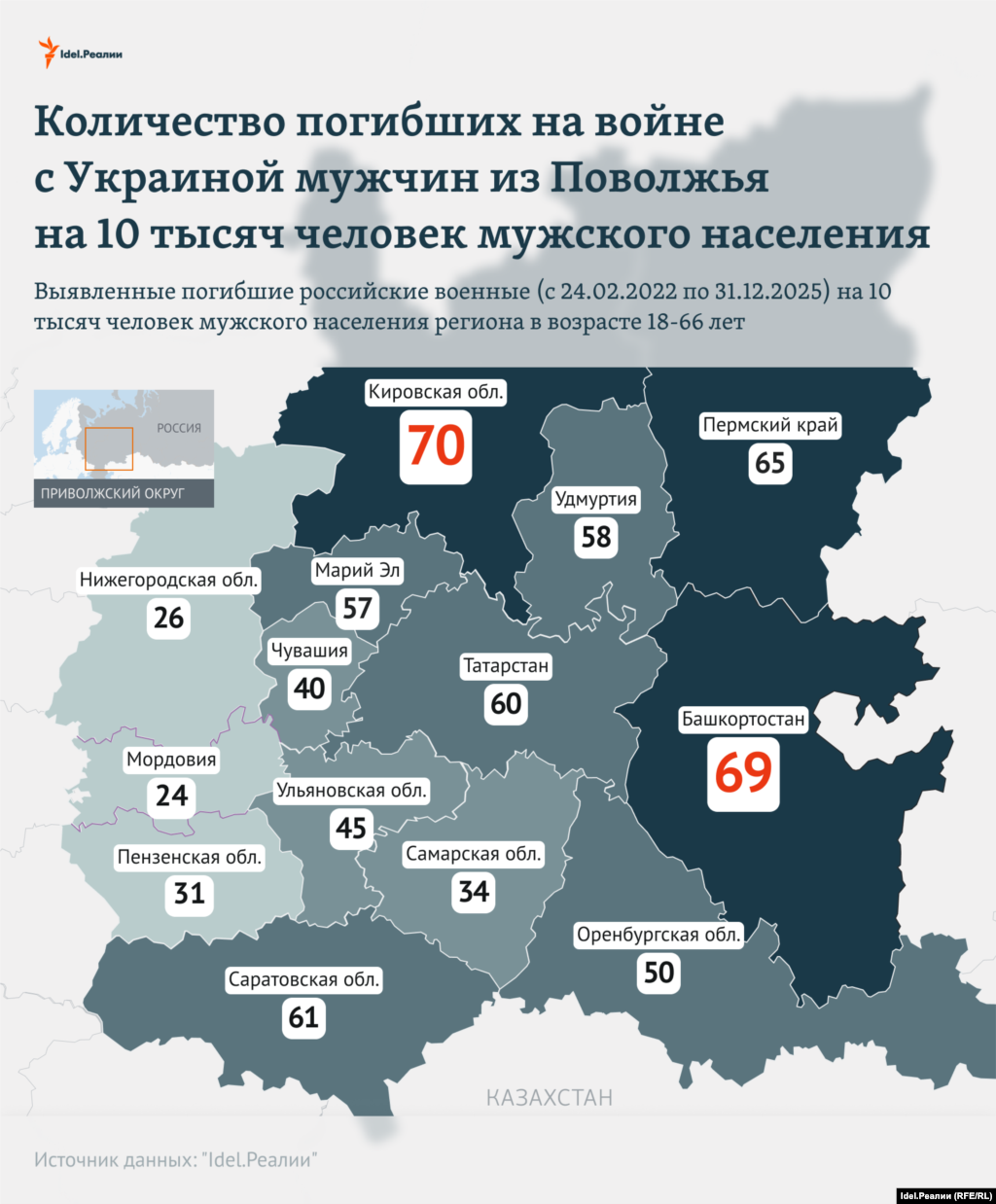 Кировская область вновь стала лидером в Поволжье по количеству погибших на войне против Украины на 10 тысяч мужского населения (70 мужчин) в возрасте от 18 до 66 лет. Об этом свидетельствуют подсчеты "Idel.Реалии" на 31 декабря 2025 года, основанные на данных из базы погибших уроженцев Поволжья с начала полномасштабного вторжения России в Украину.